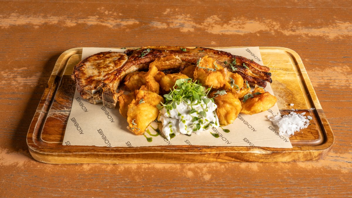 Crispy potato chunks, green apple tzatziki, freshly chopped oregano, fleur de sel