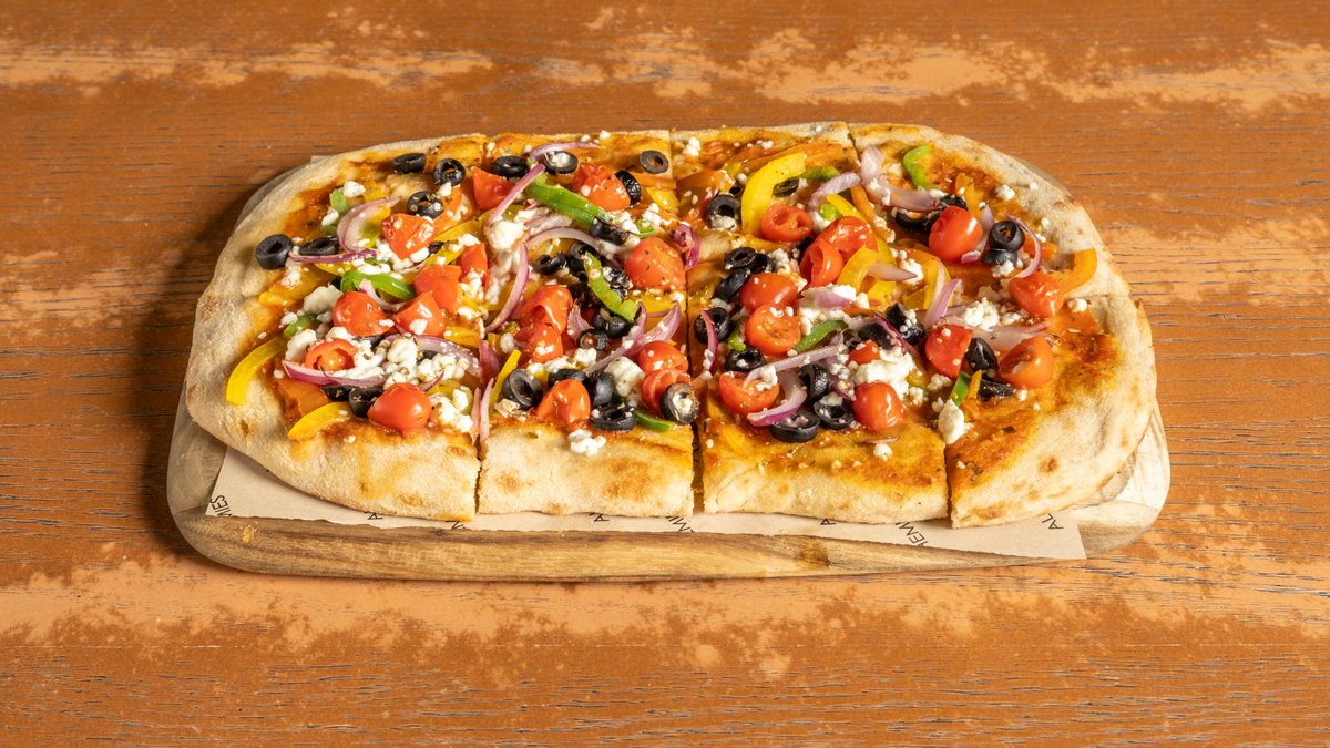 Handmade tomato sauce, olives, capers, cherry tomatoes, peppers, red onion, feta cheese, oregano