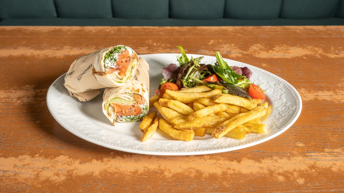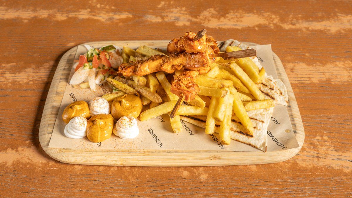 Grilled tortillas, Harissa sauce, yogurt, sour onion, marinated cucumber & tomato, fried potatoes