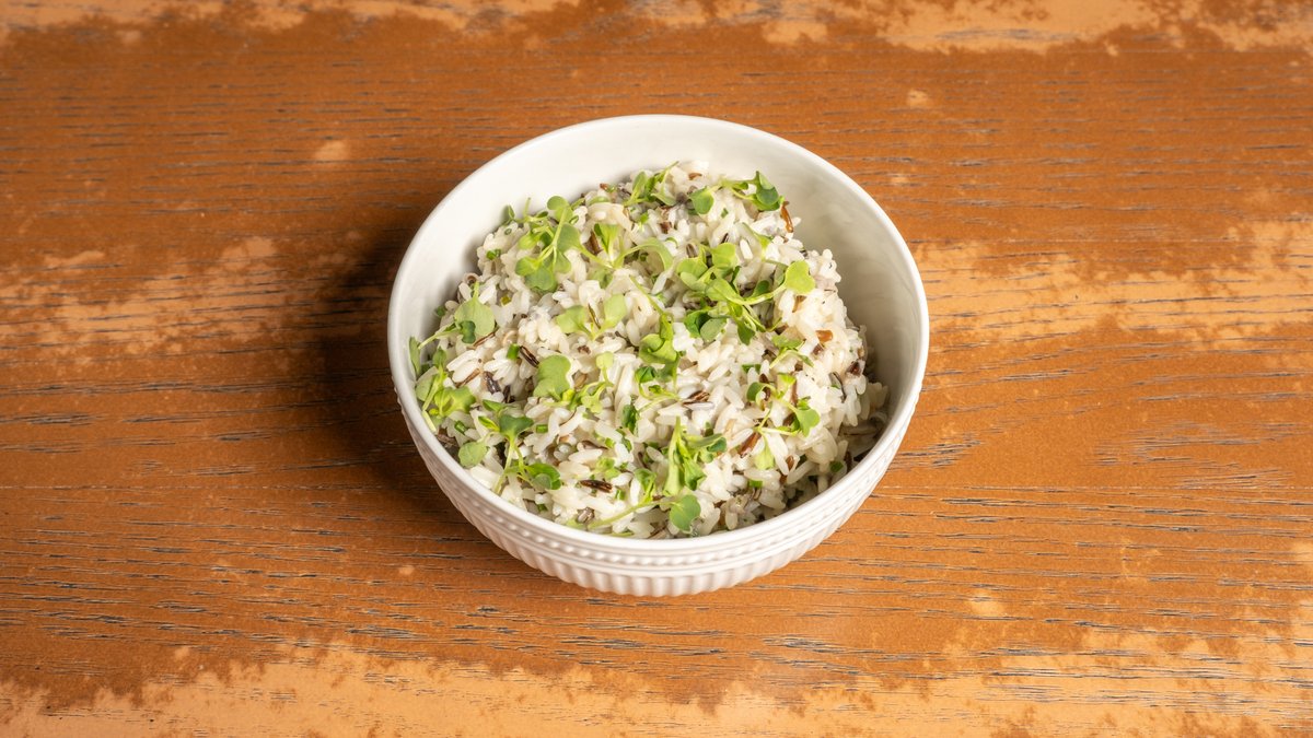 Seasonal vegetables sauté with rosemary, aromatic rice and ladolemono vinaigrette with thyme