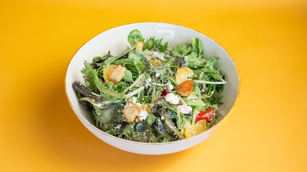 Mixed green salad with goat cheese, cherry tomatoes, orange, croutons and fresh herbs.