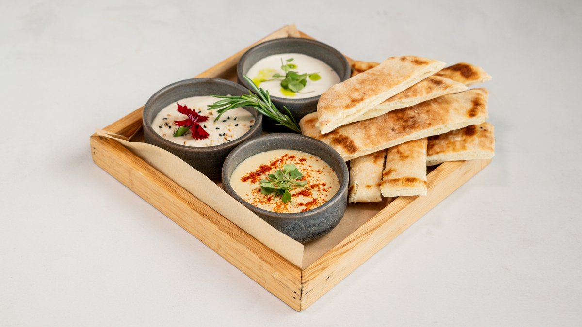 White taramas, tahini, hummus