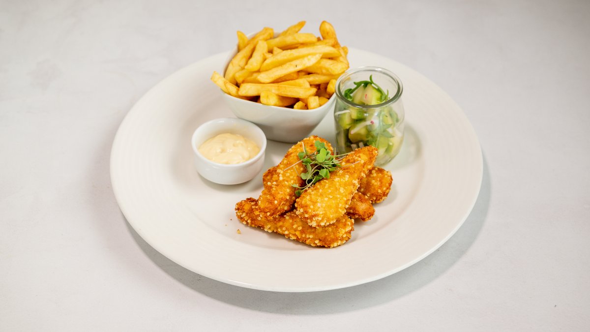 Crispy chicken fillet goujons, honey mustard sauce, french fries