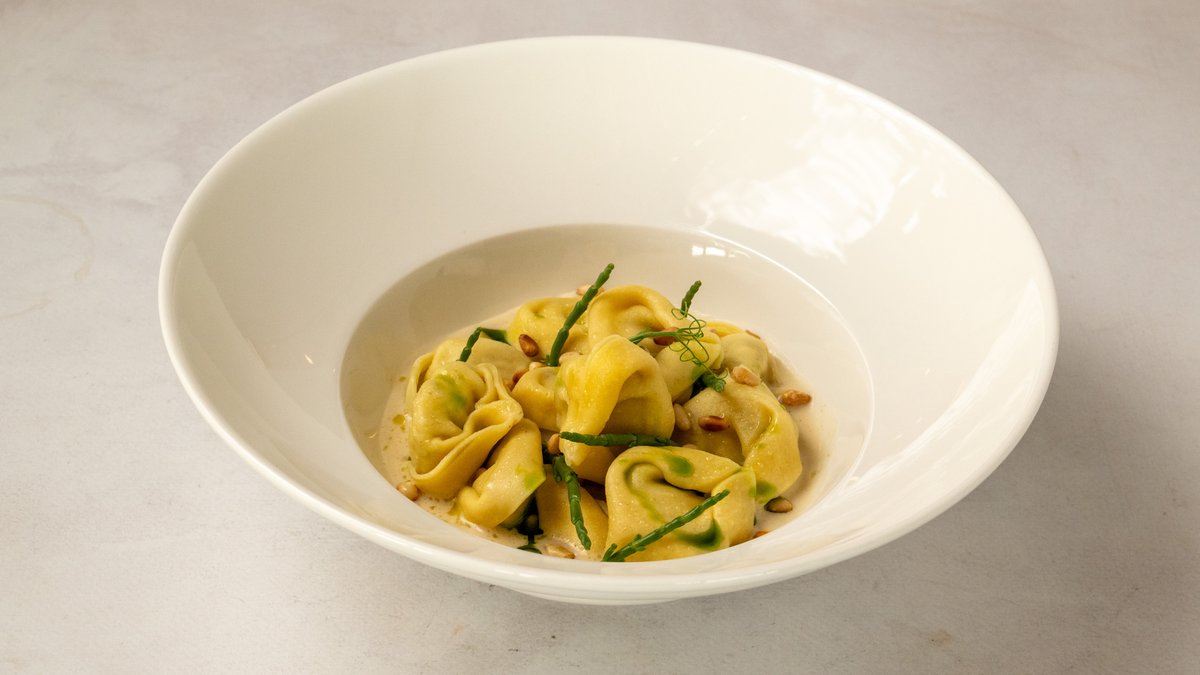 Tortellini with porcini mushroom stuffing, Parmesan creamy sauce, pine nuts