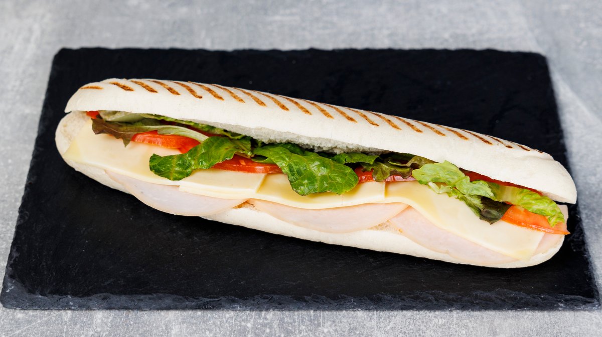 Baguette, turkey, edam cheese, creamy cheese, lettuce, tomato