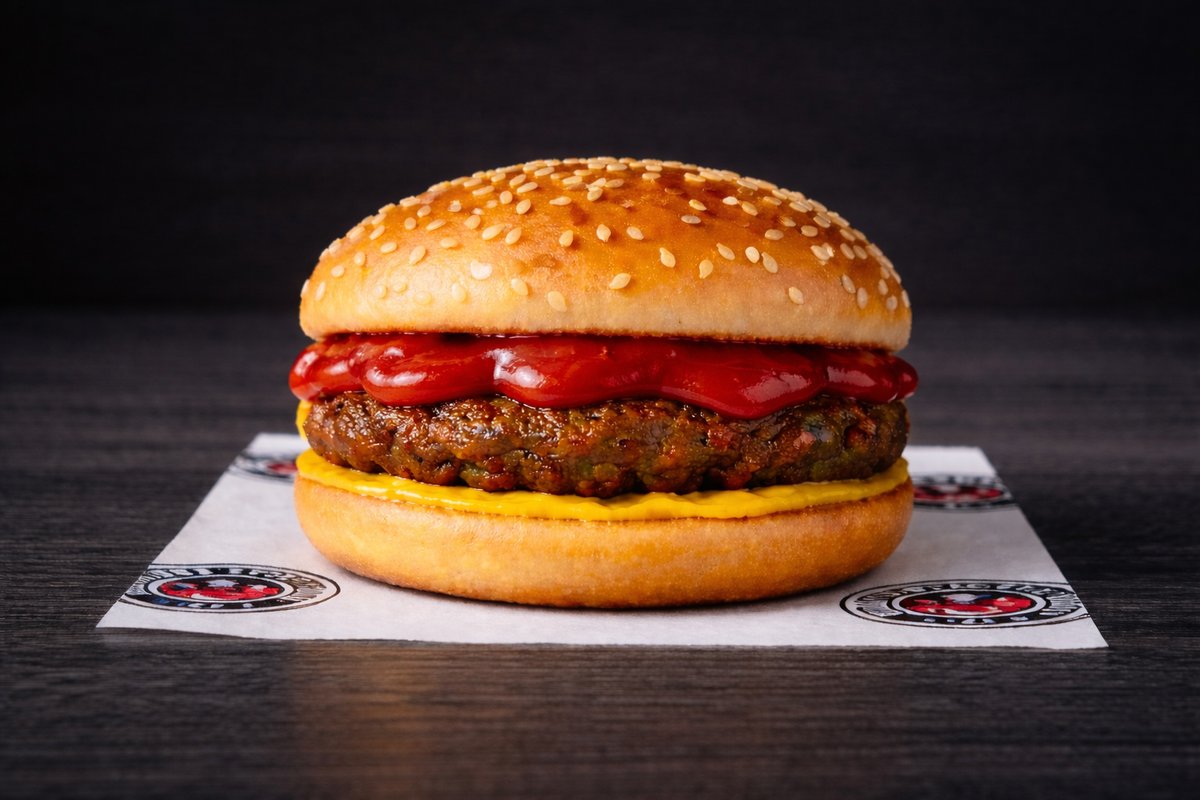 Beef patty, ketchup. Served in sesame bun