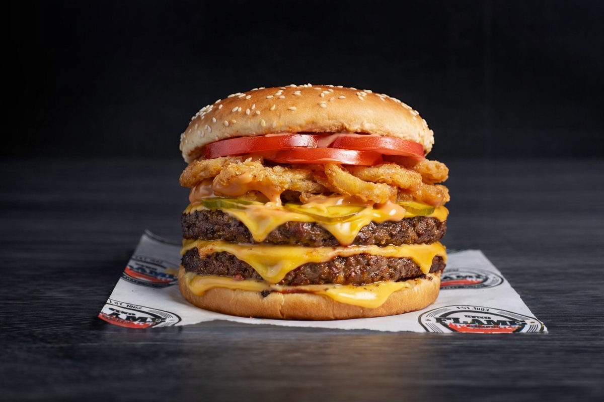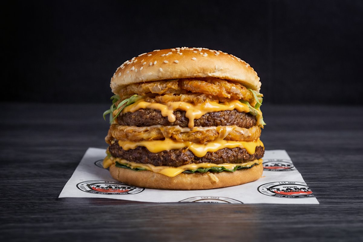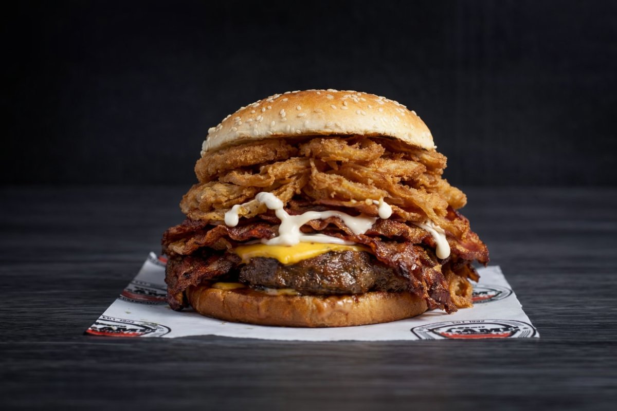 A hefty 500g beef stack built for true appetite warriors, layered with double melted cheese and bacon served in a lightly toasted bun