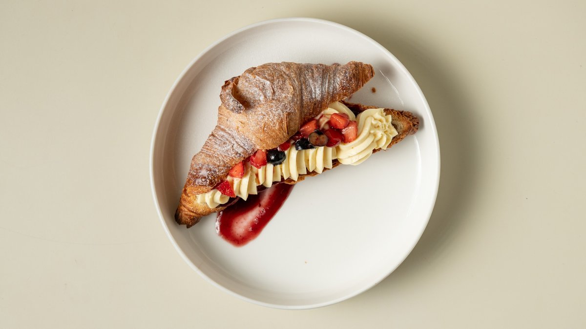 A soft, flaky croissant filled with creamy filling, fresh strawberries, and topped with sweet red fruit sauce. A tasty and fresh treat for any time of day. Мягкий, слоёный круассан с кремом, свежей клубникой и поливкой из сладкого красного фруктового соуса. Вкусное и свежее угощение в любое время дня.