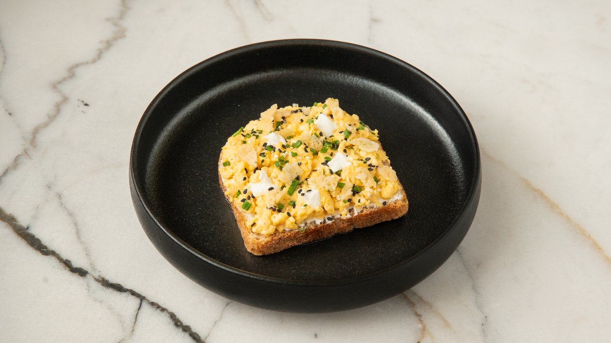 Fluffy scrambled eggs on wholegrain toast, topped with creamy whipped cheese and a sprinkle of fresh chives. A simple yet comforting breakfast classic.