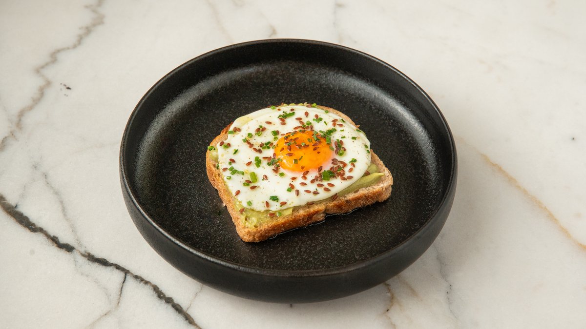 Smashed avocado on wholegrain toast, topped with a perfectly cooked sunny-side egg.