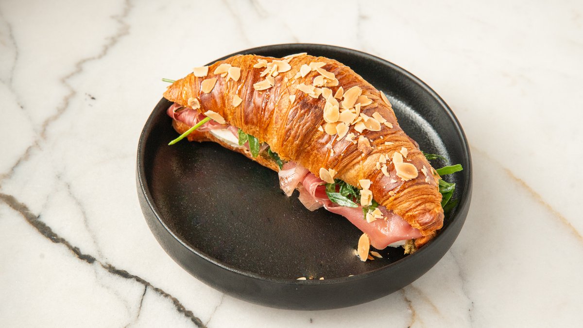 A golden, buttery croissant filled with delicate prosciutto and creamy melted mozzarella. Savory, rich, and deliciously satisfying. Золотистый, сливочный круассан с тонким прошутто и нежной расплавленной моцареллой. Сытно, ароматно и по-настоящему вкусно.
