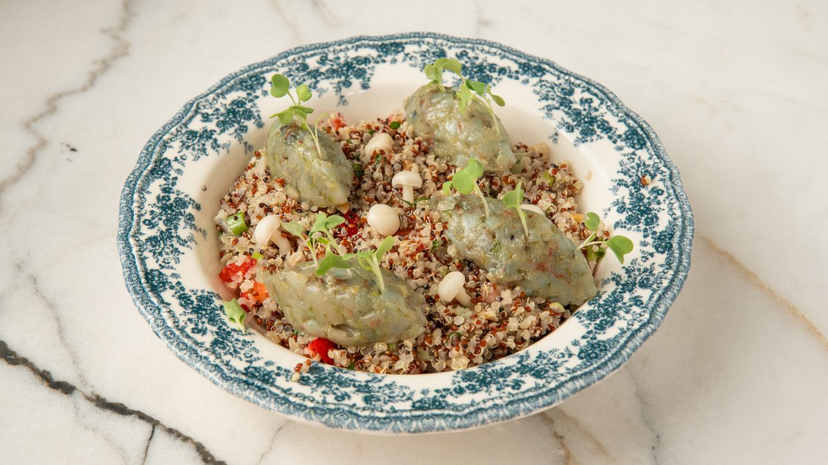 A fresh and vibrant dish with tasteful shrimp tartar over fluffy quinoa, tossed with chopped herbs, sweet strawberries, walnuts, white simeji mushrooms and a touch of lime zest. Finished with our signature dressing, it’s a perfect balance of flavor and texture — light, healthy, and delicious. Свежее и яркое блюдо с нежным тартаром из креветок на подушке из воздушной киноа, смешанной с рублеными травами, сладкой клубникой, грецкими орехами, белыми грибами симеджи и лёгкой цедрой лайма. Завершено нашей фирменной заправкой — идеальный баланс вкуса и текстуры: лёгкое, полезное и невероятно вкусное.