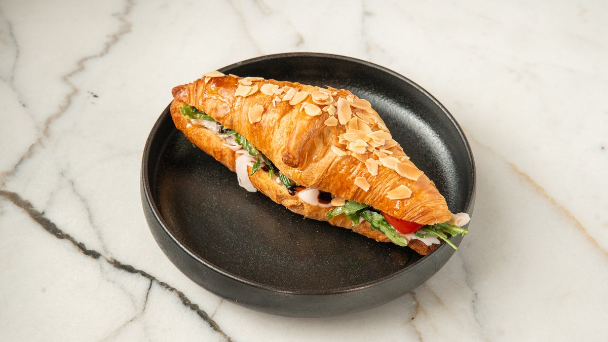 A golden, buttery croissant filled with tender smoked turkey and melted parmesan cheese. Simple, savory, and perfectly satisfying. Золотистый, сливочный круассан с нежной копчёной индейкой и расплавленным пармезаном. Просто, сытно и по-настоящему вкусно.