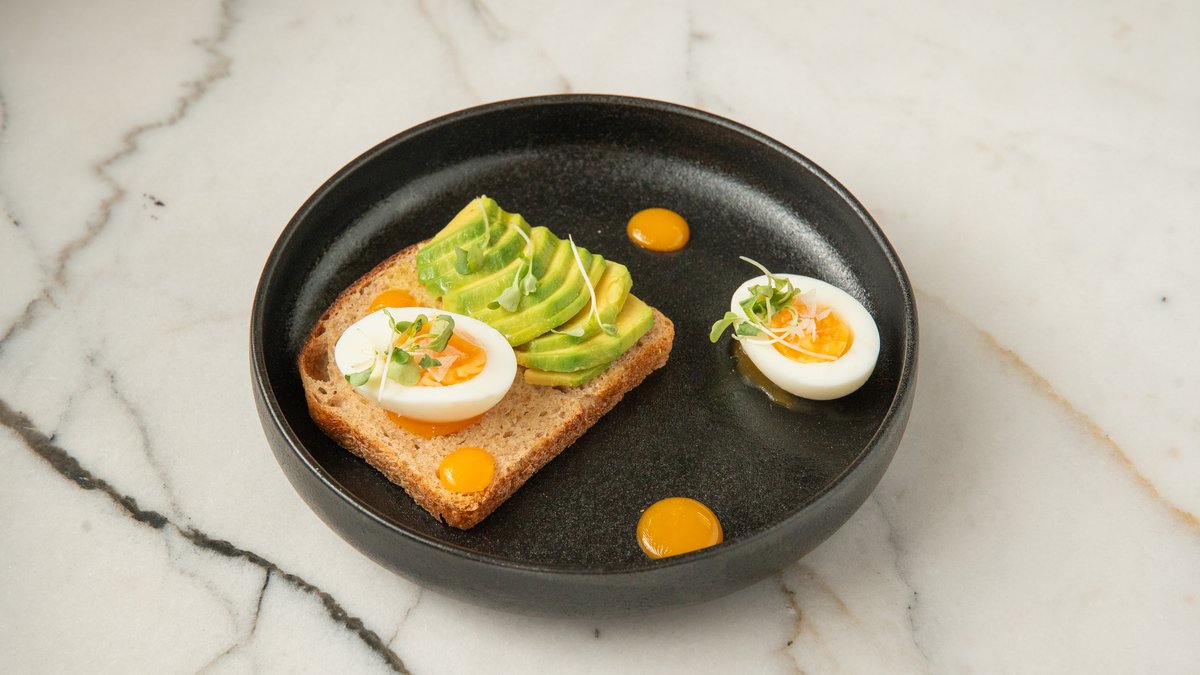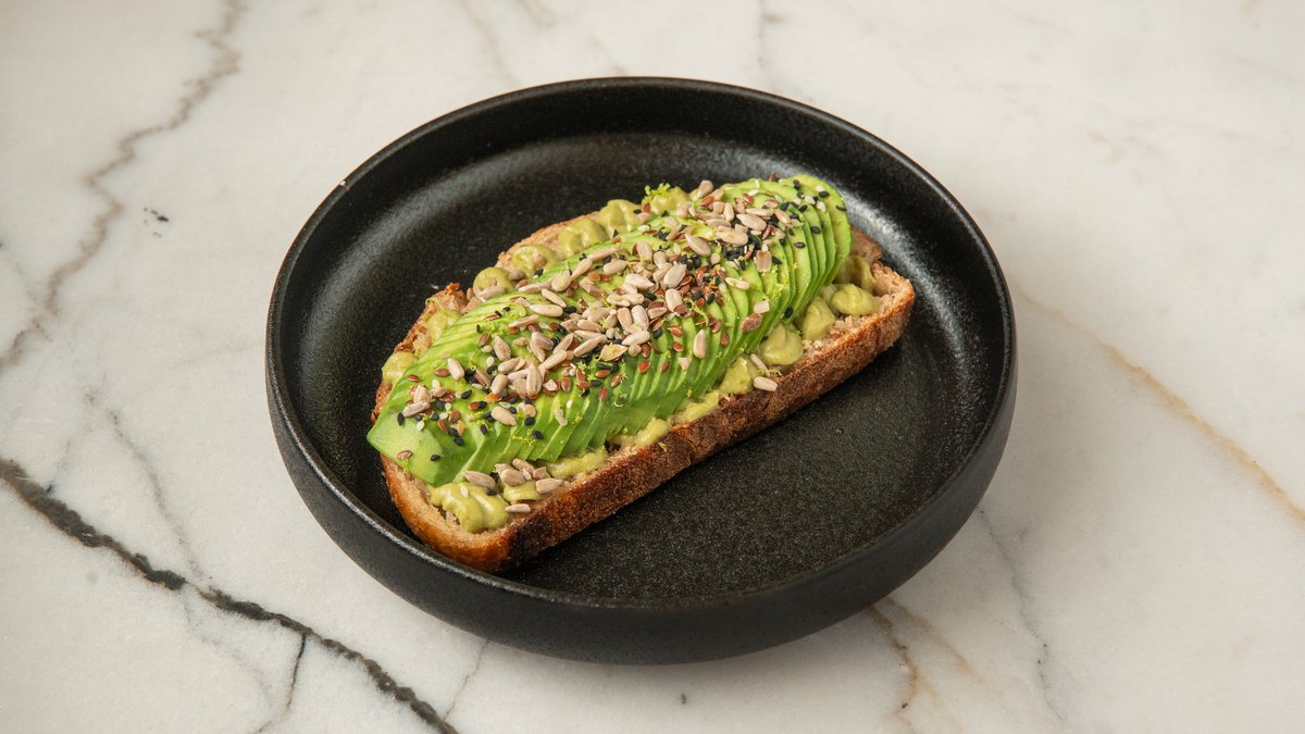 Sourdough bread topped with fresh sliced avocado, creamy avocado sauce, a sprinkle of mixed seeds, and a hint of lemon zest. A fresh take on a classic favorite. Хлеб на закваске с ломтиками свежего авокадо, нежным авокадо-соусом, посыпанный смесью семян и с легкой ноткой лимонной цедры. Свежий взгляд на классическое блюдо.