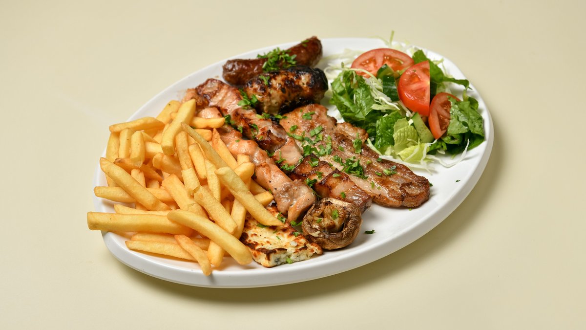 For two persons Includes (souvlaki,sieftalia,sausage,pork chops,chicken kebab,halloumi)