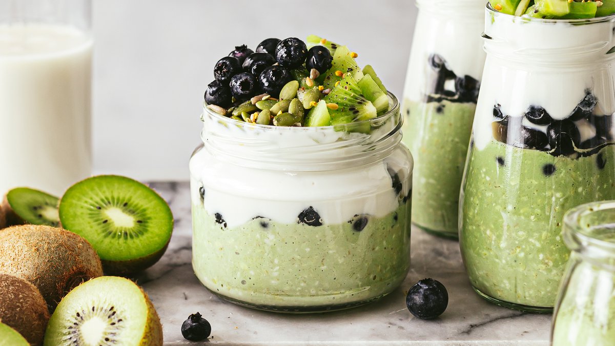 Matcha Yogurt / Greek Yogurt, Matcha Powder Organic Iswari, Kiwi, Blueberries, Banana, Gluten free Oats, Honey.