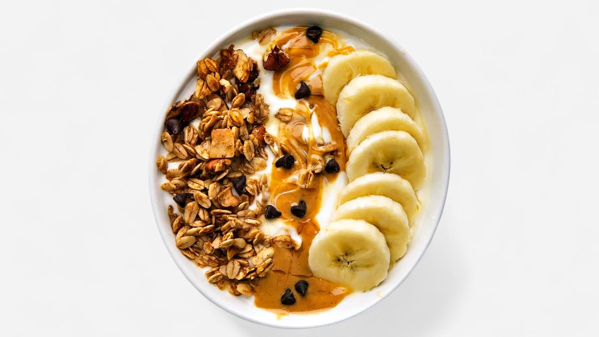 Yogurt & Hazelnut Chocolate Spread, Dark Chocolate Bits, Granola, Blueberries & Banana.