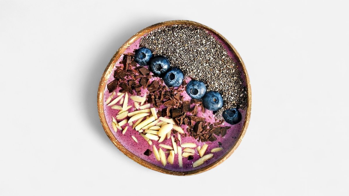 Blended Berry, Banana & Raw Cacao Yogurt. Topped With Banana , Blueberry, Dark Chocolate Chunks, Chia Seeds And Coconut Shreds.. Size Plus.