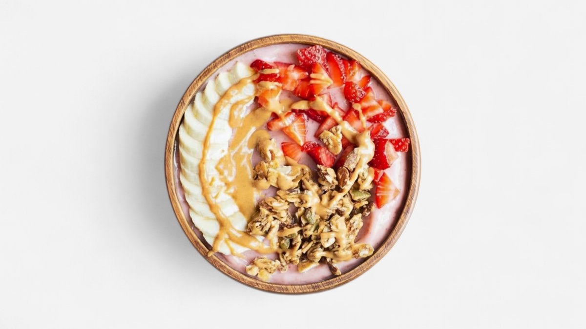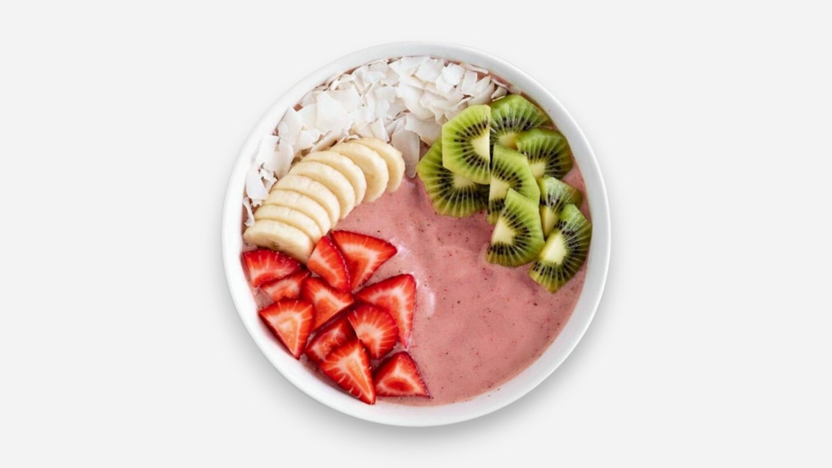 Blended Banana & Strawberry Yogurt. Topped With Banana, Kiwi, Strawberry, Coconut Shreds And Gluten Free Oats. Size Plus.
