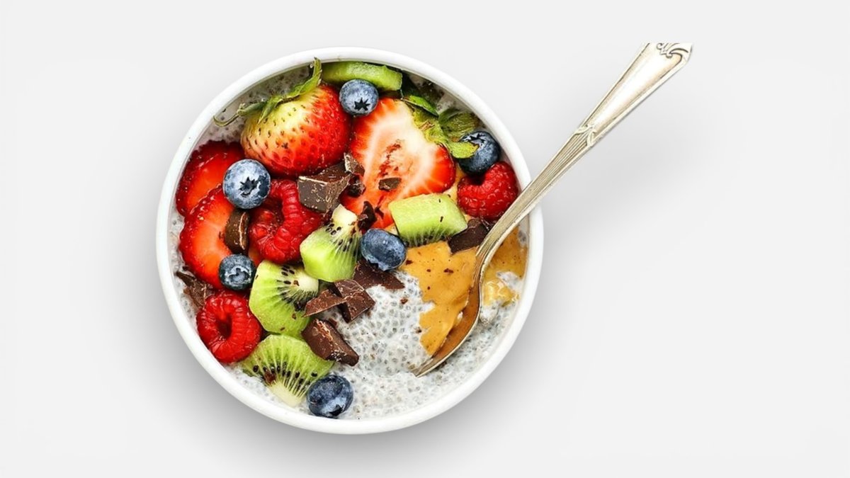 Acai Layered Chia Pudding Bowl. Topped With Strawberries, Blueberries, Kiwi, Banana, Peanut Butter, Granola & Dark Choco Bits. Size Plus.