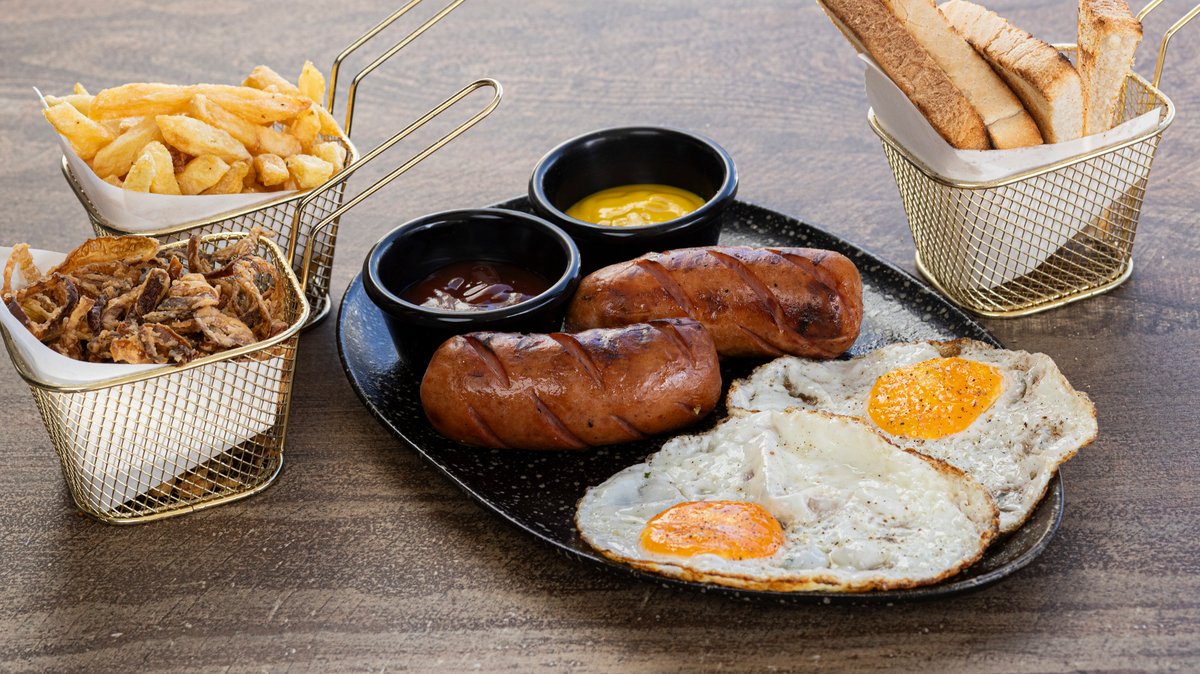 3 αυγά τηγανητά, μπέικον, γερμανικό λουκάνικο, φασόλια φούρνου, χαλούμι, μανιτάρι, ψητή ντομάτα, πράσινη συνοδευτική σαλάτα σερβίρεται με φρυγανισμένο ψωμί, βούτυρο και μαρμελάδα