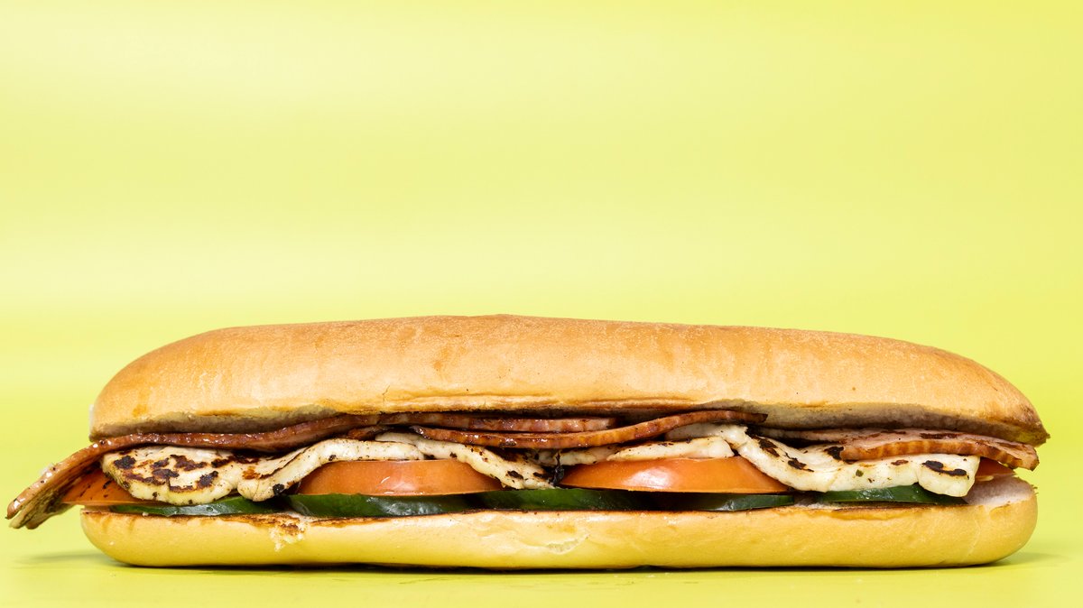 Σερβίρεται με μπέικον, χαλούμι, ντομάτα και αγγουράκι