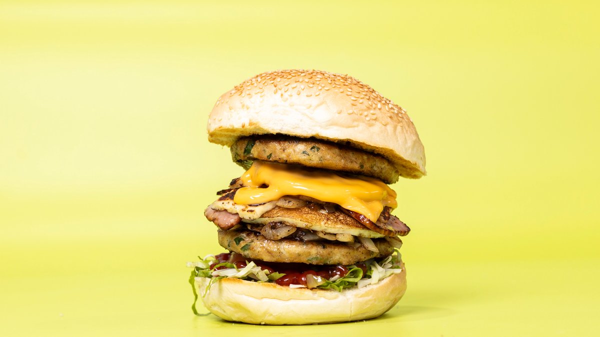 Διπλό μπέργκερ με ένα βοδινό μπιφτέκι 150 γρ. από 100% μοσχαρίσιο κρέας και ένα χοιρινό μπιφτέκι των 110 γρ. σερβιρισμένο σε ψωμάκι με κραμπί, μαρούλι, ντομάτα και κέτσαπ και φτιάξτε το όπως θέλετε!