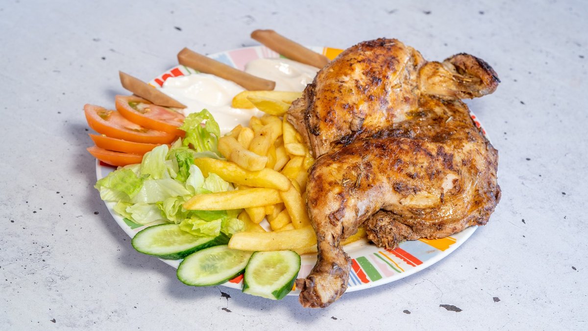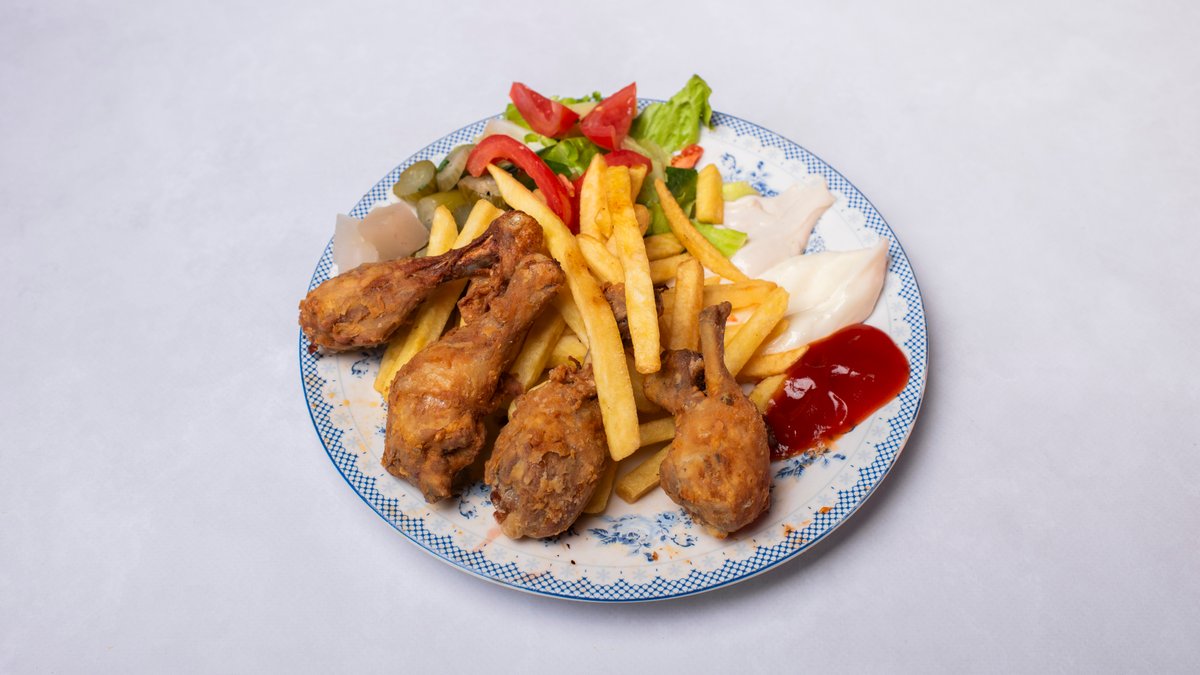 4 pcs chicken legs, 8 pcs chicken wings, 300g beef liver, 2pcs chiken escalope, chips, salad and 4 drinks