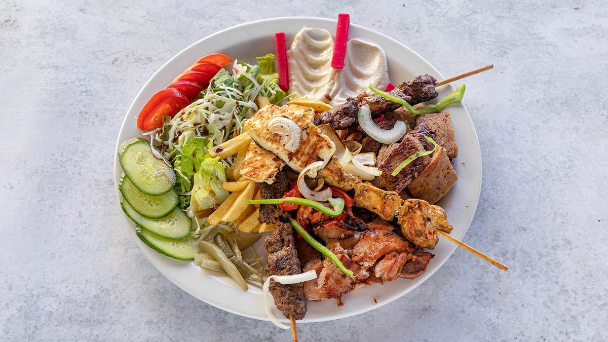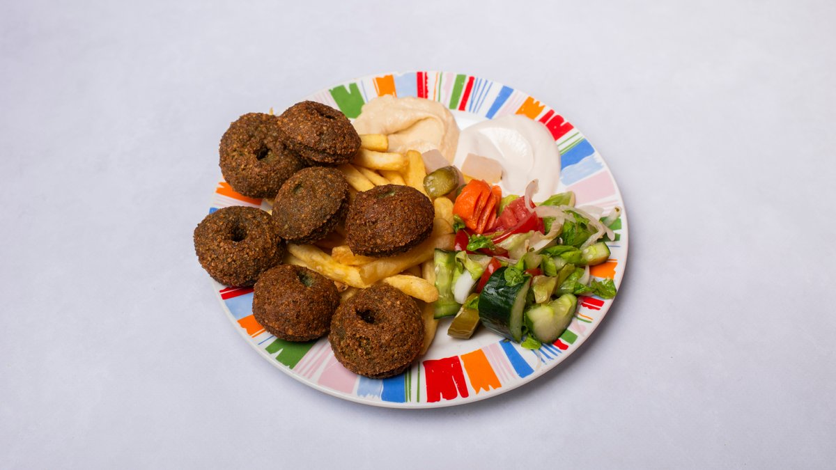 1 burger (chicken or beef), 1 sandwich (chicken or beef), 5pcs falafel, 5 pcs nuggets, 2 pcs mici, 2 pcs taouk, chips, salad, 2 drinks