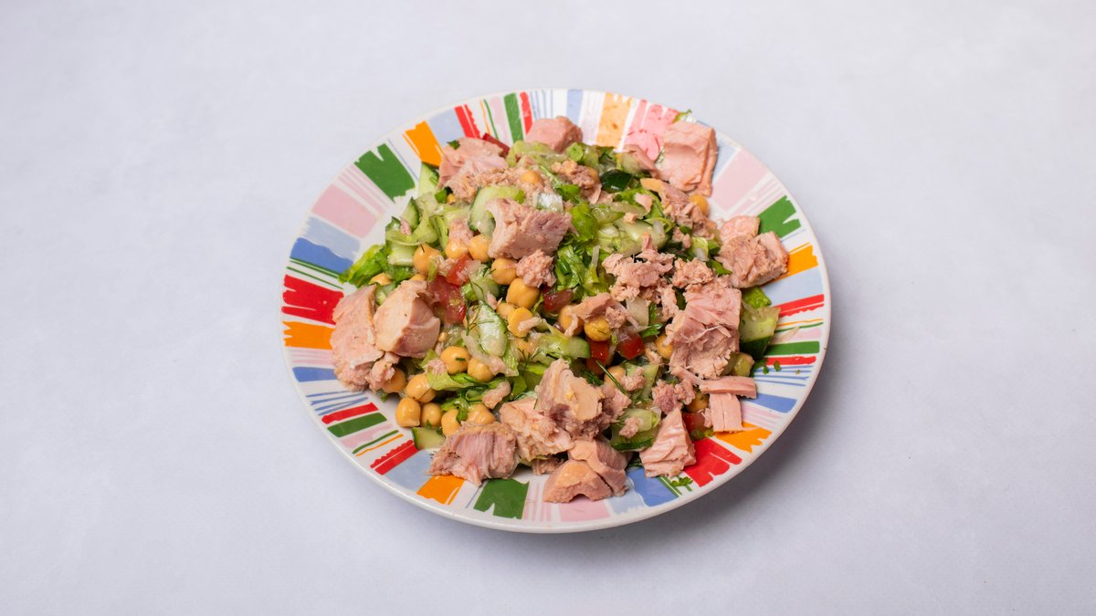 Lettuce, tomato, fried bread, cucumber, radish, onion, mint, pomegranate sauce, lemon, olive oil