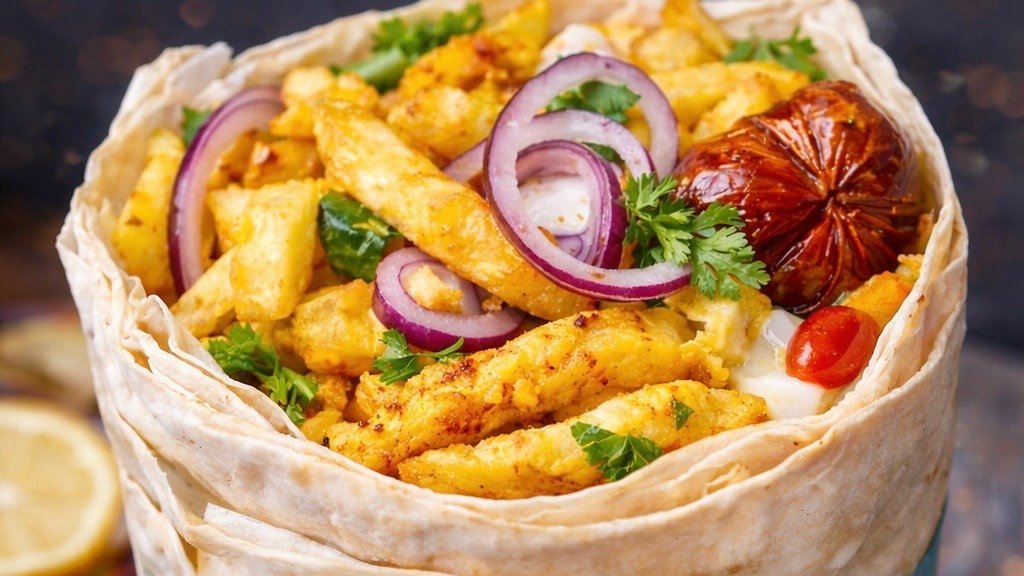 fries, chicken, egg, onion, coriander, mayonnaise, ketchup, black pepper.