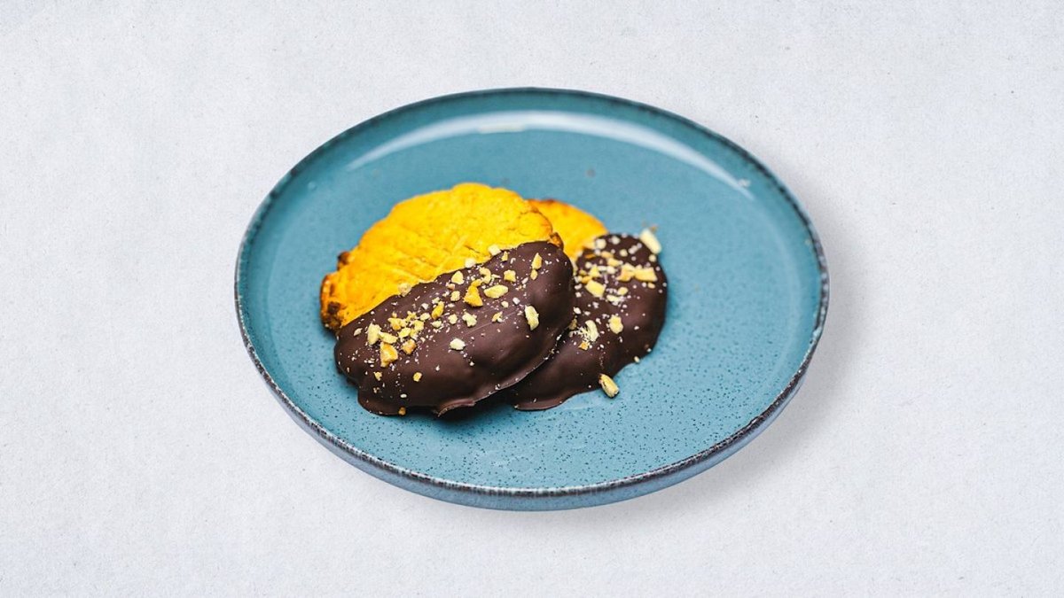 Hazelnut butter, oat flour, chocolate whey protein, honey, cocoa, hazelnuts, dark chocolate. 250kcal / p: 14g c: 22g f: 15g