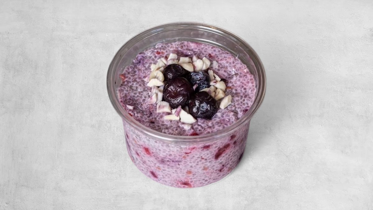 Blueberries, strawberries, walnuts, chia seeds, spinach, almond milk