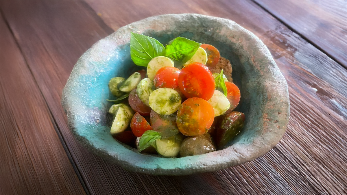 Fresh mini mozzarella with "tacos" fresh cherry tomato, basil pesto and extra virgin olive oil