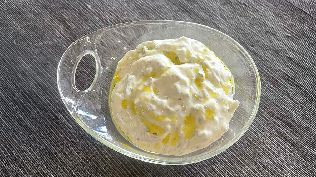 yogurt, cucumber, garlic, dry mint, vinegar, olive oil