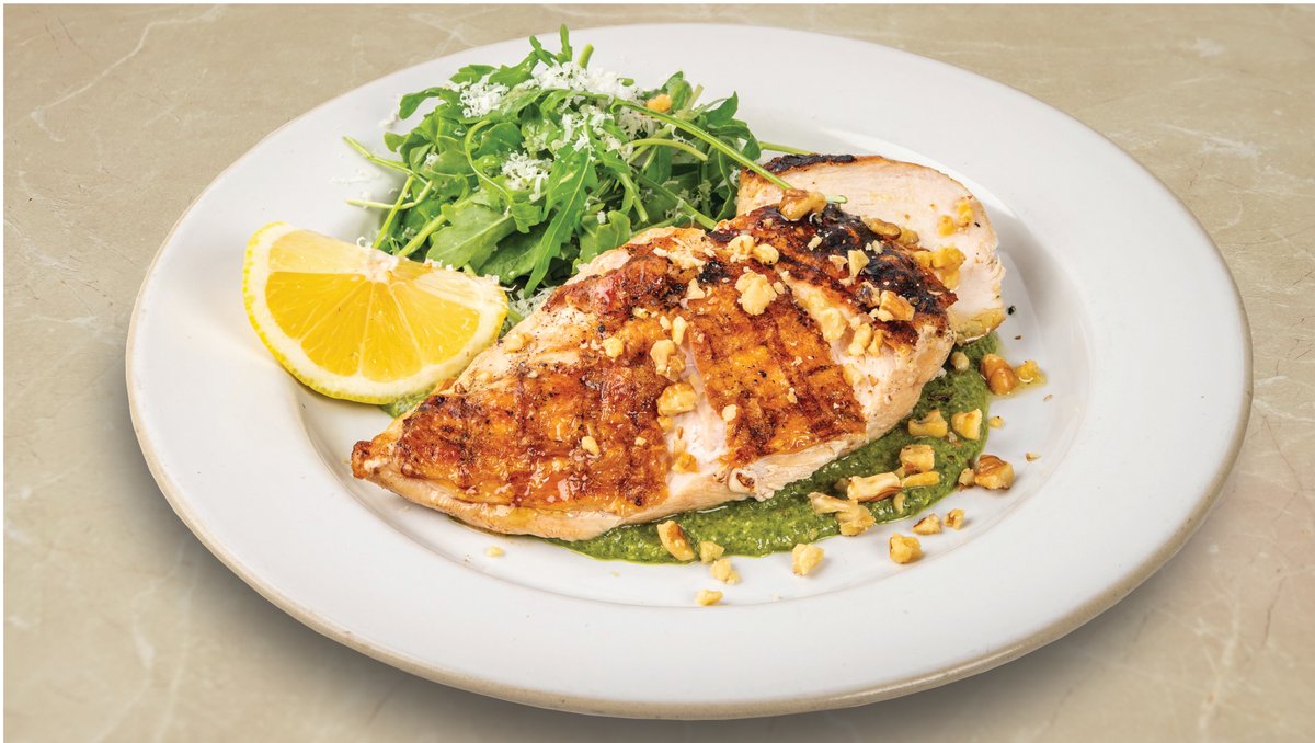 Marinated & grilled chicken fillet, walnut & spinach pesto, rocket, lemon