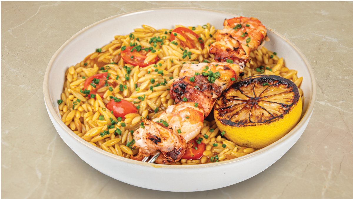 Octopus & prawn skewer, garlic, anchovy & tomato orzo, charred lemon, fresh chives