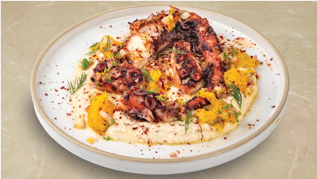 Garlic & chilli-braised octopus, silky butterbean hummus, zingy orange & red onion salsa, sumac