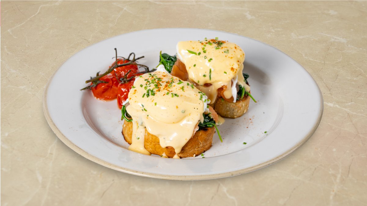 Smoked salmon, poached eggs, wilted spinach, hollandaise sauce, toasted Cypriot koulouri, slow-roasted tomatoes