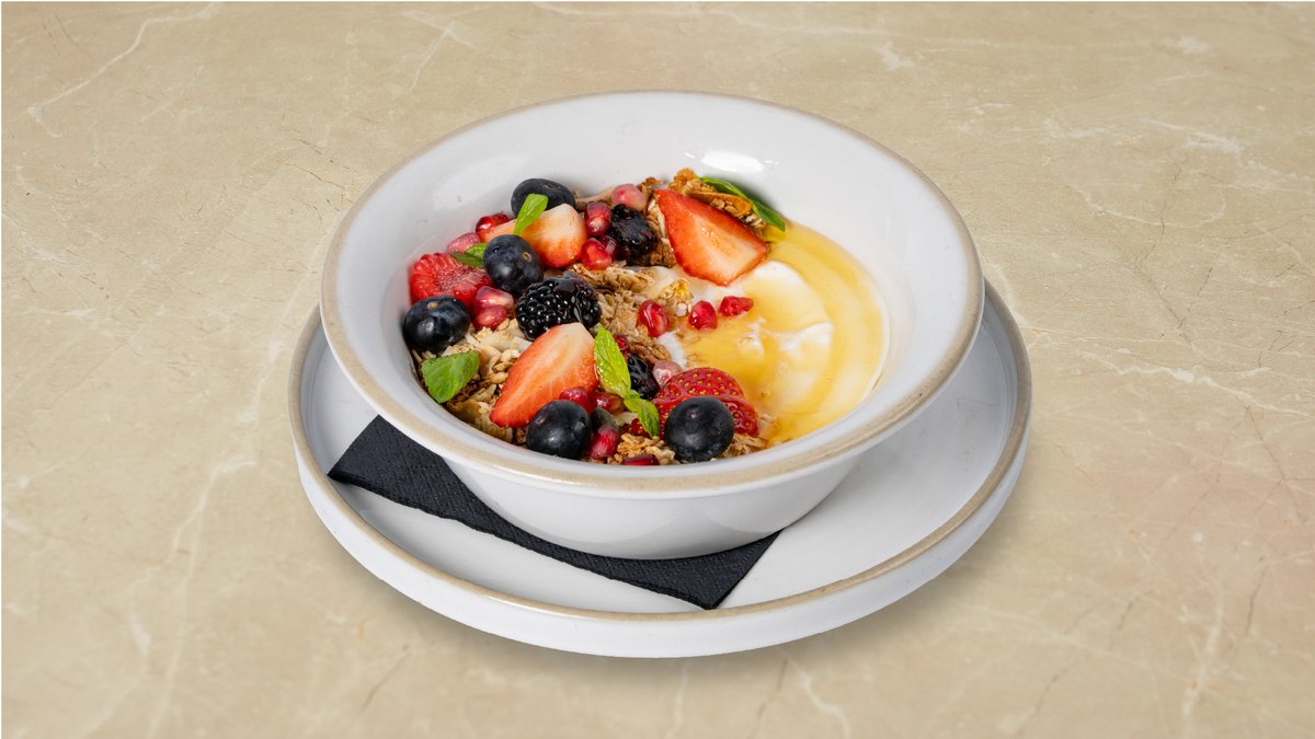 Spiced granola, yoghurt, fresh mixed berries, pomegranate seeds and honey
