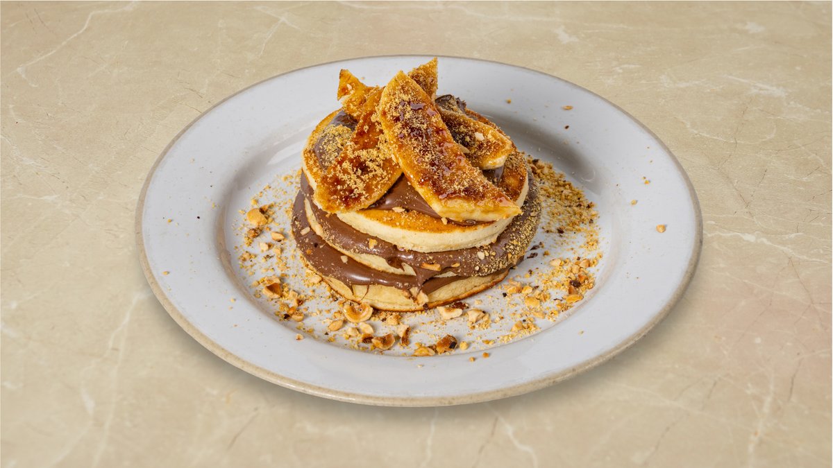 Fluffy pancakes with Nutella, caramelized banana and crushed