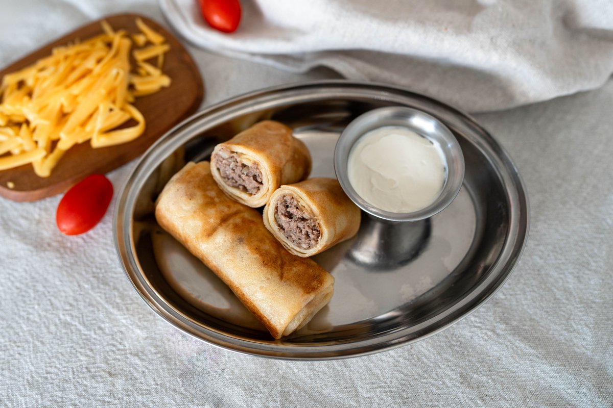 Σπιτικές λεπτές τηγανίτες γεμιστές με μοσχάρι και μπαχαρικά