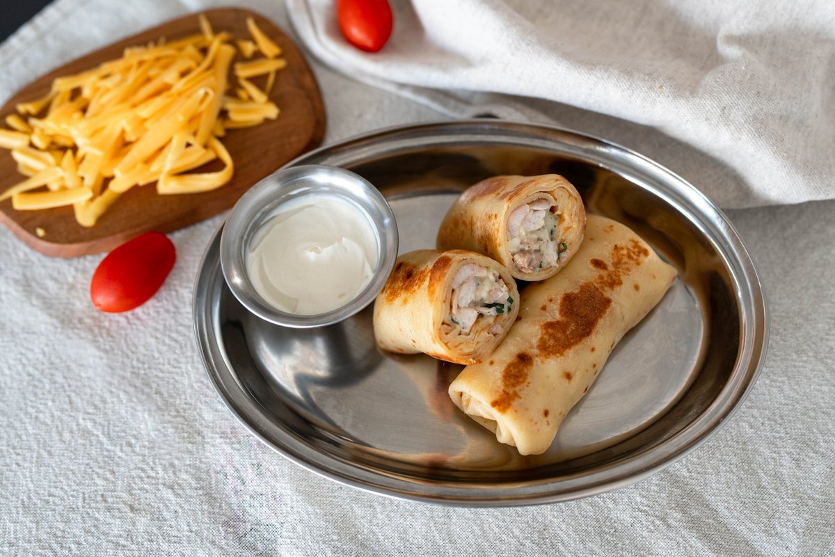 Σπιτικές λεπτές τηγανίτες γεμιστές με κιμά κοτόπουλου και τυρί