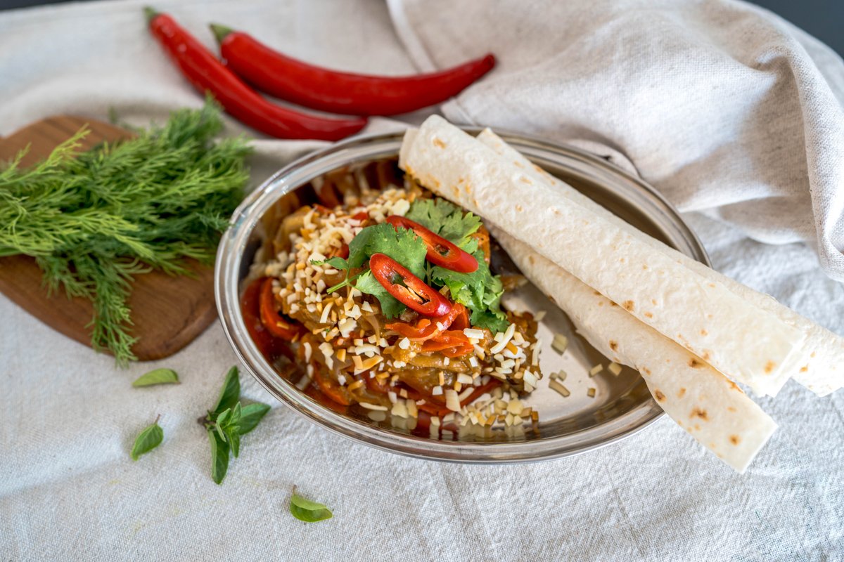 Αρωματικό στιφάδο μελιτζάνας, γλυκές πιπεριές, ντομάτα και σέλινο, σερβιρισμένο με καπνιστό τυρί και αφράτη πίτα. Ένα τολμηρό κλασικό vegetarian