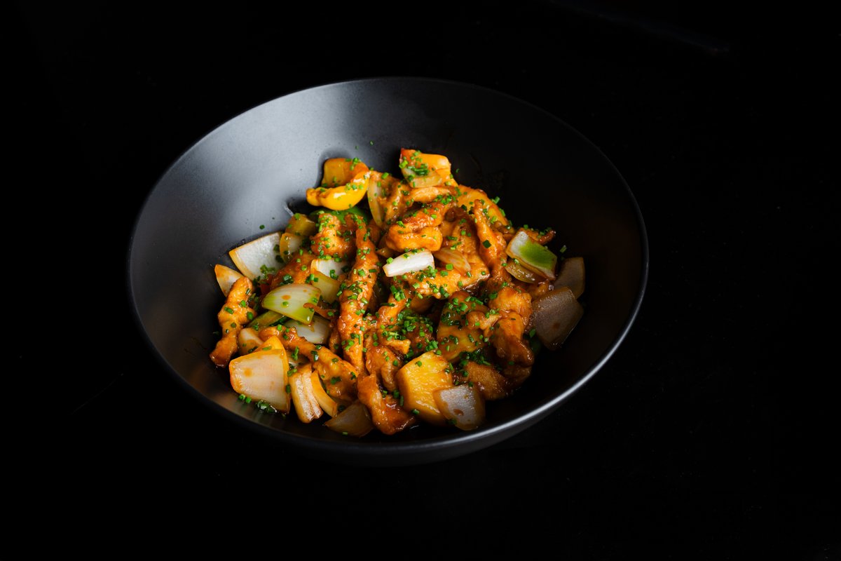 Chicken fillet pieces in rich chinese sweet and sour sauce with seasonal vegetables