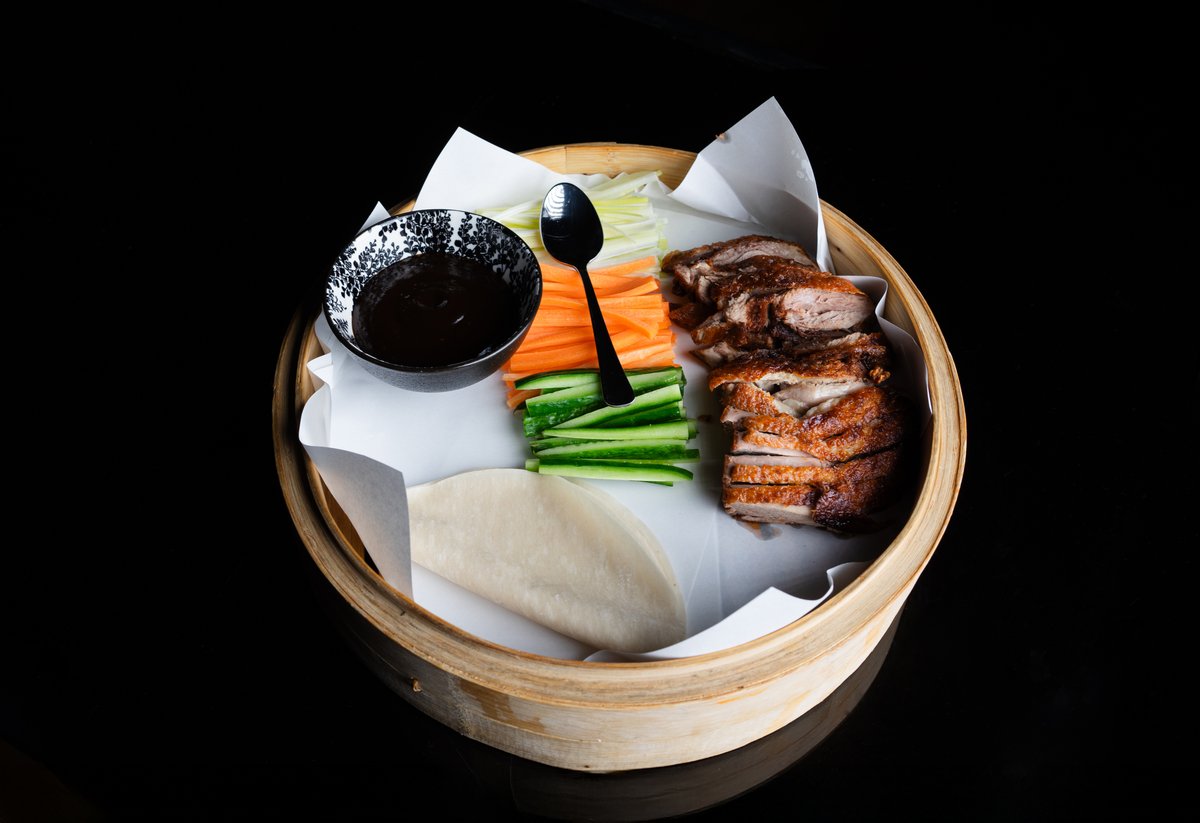 Crispy and aromatic peking duck served with warm pancakes, and hoi sin sauce, accompanied with fine threads of carrots, cucumber and spring onions