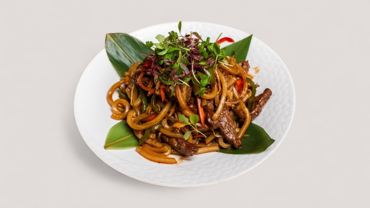 Soba noodles with juicy sautéed beef and crispy vegetables in a classic tonkatsu sauce