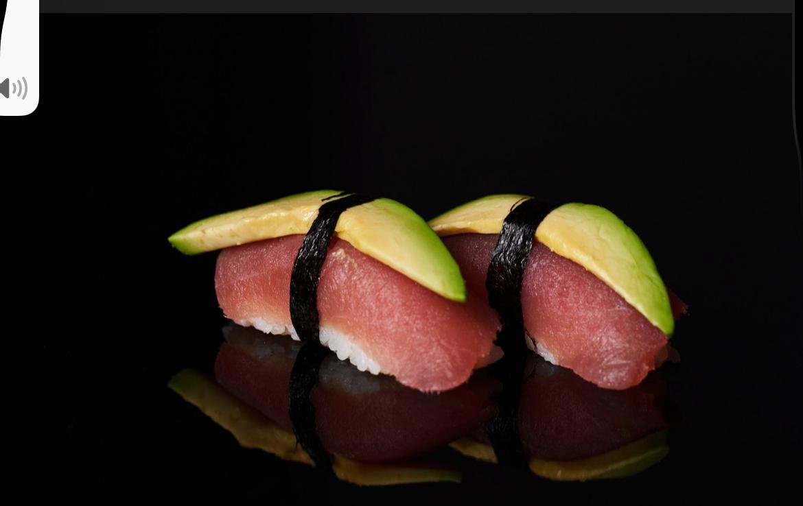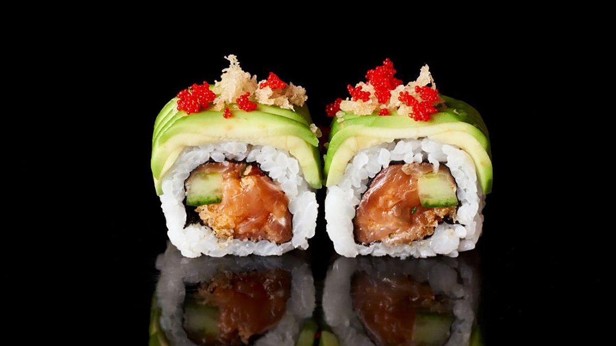 Nori, rice, salmon tartar, cucumber, avocado, Tanuki, red tobico, spicy sauce