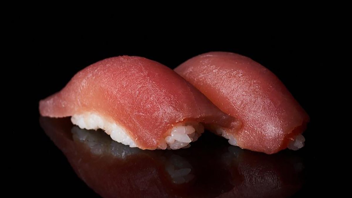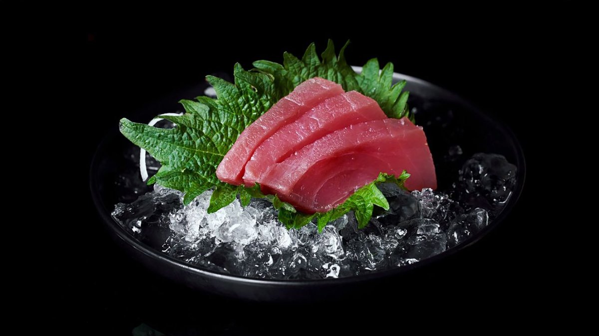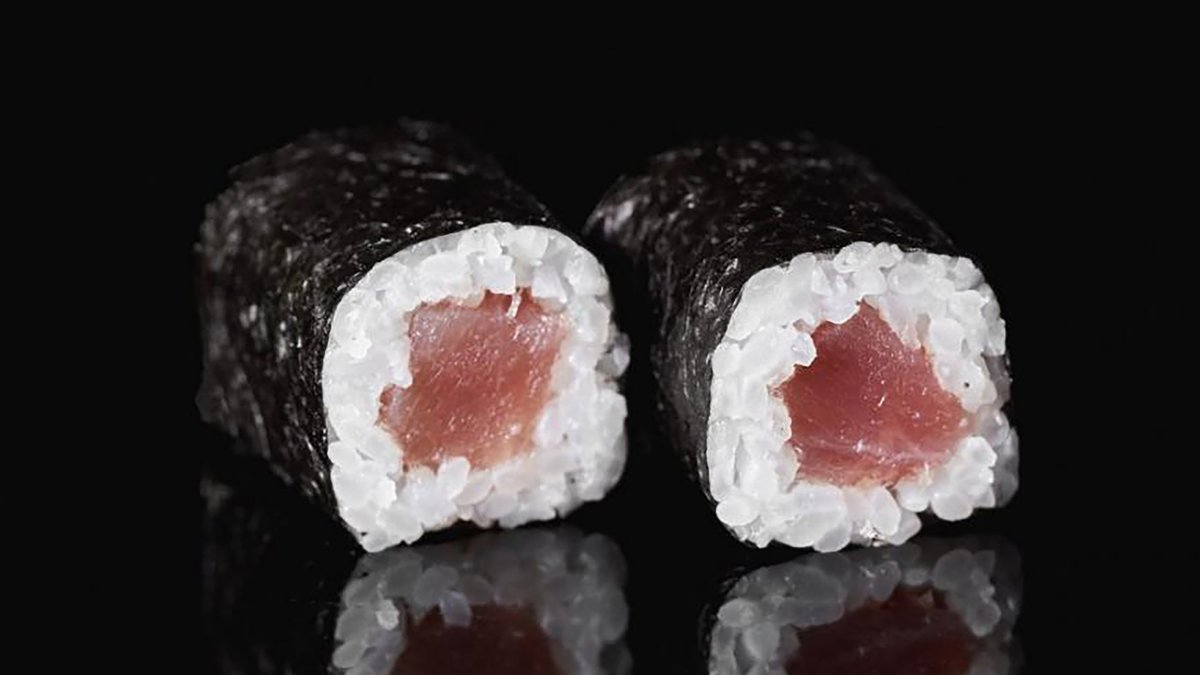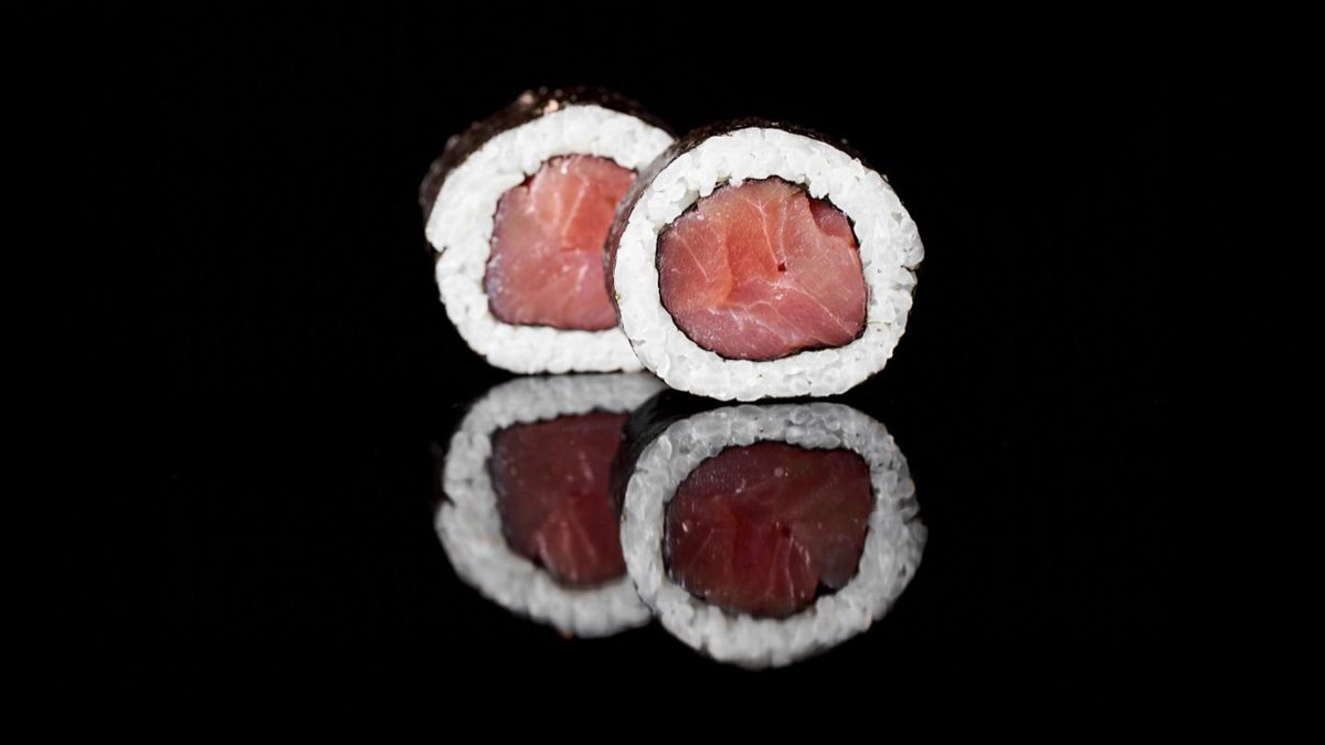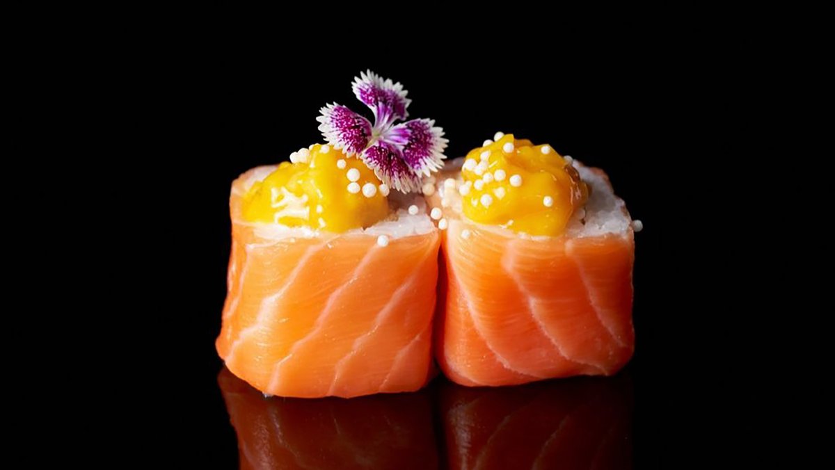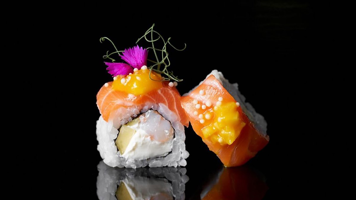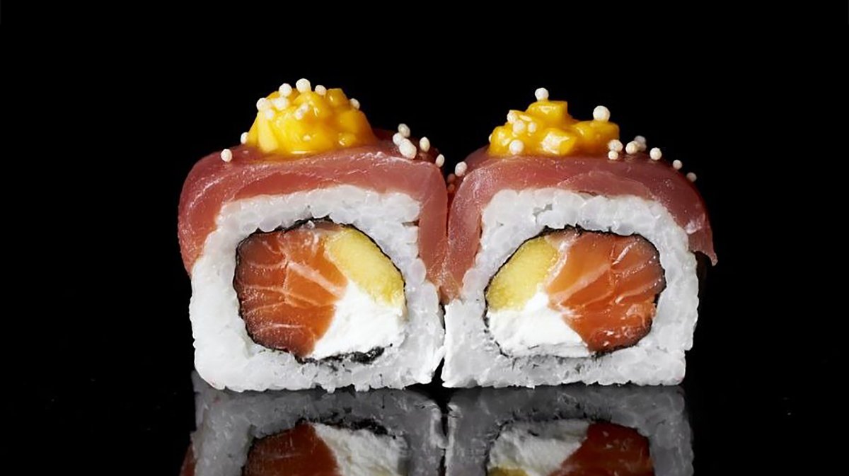 Nori, rice, tuna, salmon, mango, Philadelphia cheese, mango pure, Arare