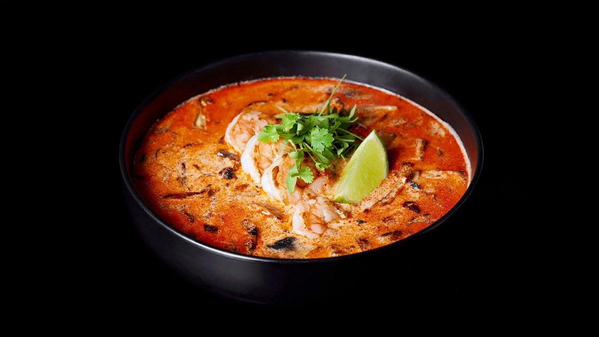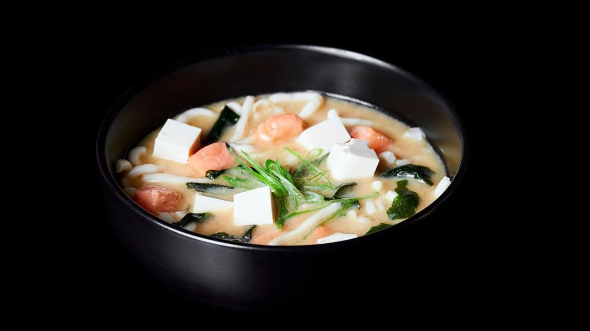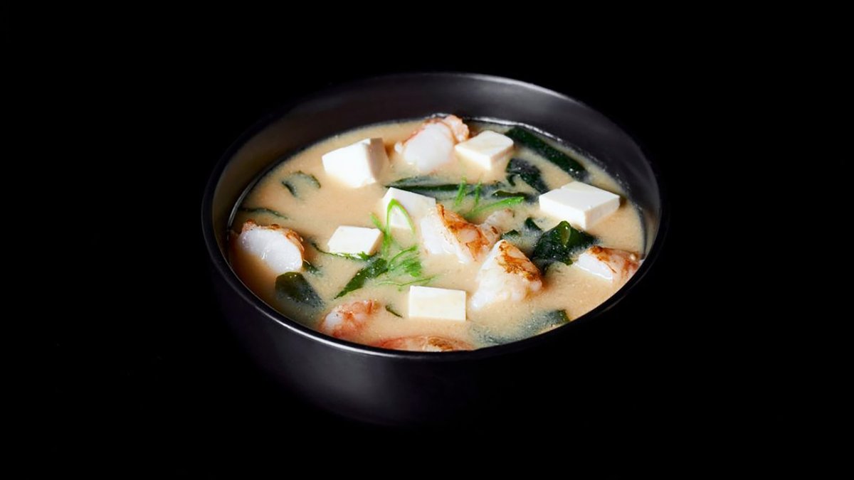 Tiger shrimps, Tofu cheese, Wakame, spring onions, spicy miso bouillon